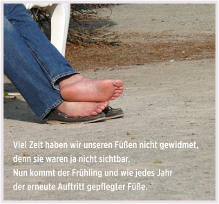 Eingesperrt in geschlossene Schuhe, haben unsere Füße uns die letzten Monate durchs Leben getragen. Viel Zeit haben wir ihnen nicht gewidmet, denn sie waren ja nicht sichtbar. Nun kommt der Frühling und wie jedes Jahr der erneute Auftritt gepflegter Füße.